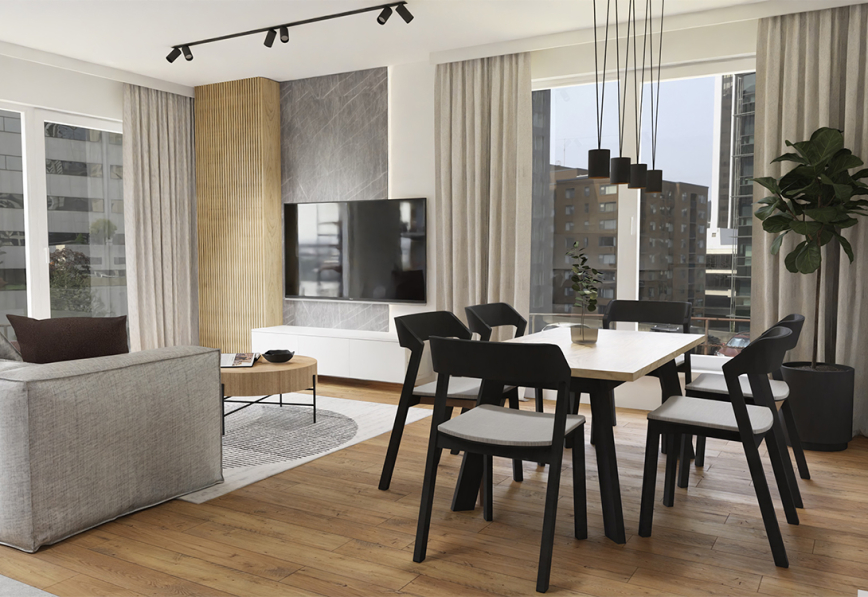 Weronika Kurzawa's design is a harmonious space where the lounge area, dining area and kitchen seamlessly intermingle to create a coherent whole. The dominant grey colours give the interior a modern, elegant and masculine character. Despite this neutral colour palette, the interior is not dull and the atmosphere it creates is pleasant, thanks to the use of a variety of materials. An important element is the textiles, such as the curtains, the sofa and the upholstery on the wall, which add warmth and comfort. The wood motif, which is interspersed on the kitchen furniture and table, brings a natural element to the interior, softening the harshness of the grey. Lighting has been carefully chosen to separate specific zones in the flat. The More Tone lamp, hanging above the table, is a decorative element of this space. Interestingly, it is possible to mount it to the ceiling in various configurations, e.g. in a straight line or as a circle. Weronika Kurzawa's design is the perfect combination of functionality, elegance and cosiness, making the flat not only a place to live, but also an aesthetic space to spend time in, while maintaining a distinctly masculine character.